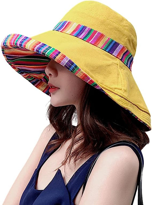 Women Cotton Wide Brim Sun Hats Metal Wired Edge Summer UV Protection UPF Boho Hat for Beach Hiking Garden Travel Chin Strap